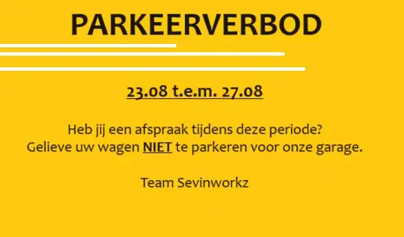 Gelieve tijdens deze periode niet voor onze garage, in het gras of bij de buren te parkeren. Je kan parkeren verderop in de straat, waar voldoende plaats voorzien is. Van daaruit is het slechts een kleine wandeling naar onze garage.